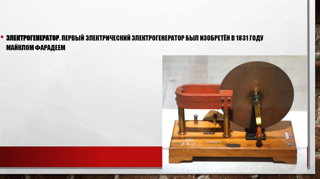 • ЭЛЕКТРОГЕНЕРАТОР. ПЕРВЫЙ ЭЛЕКТРИЧЕСКИЙ ЭЛЕКТРОГЕНЕРАТОР БЫЛ ИЗОБРЕТЁН В 1831 ГОДУМАЙКЛОМ ФАРАДЕЕМ
