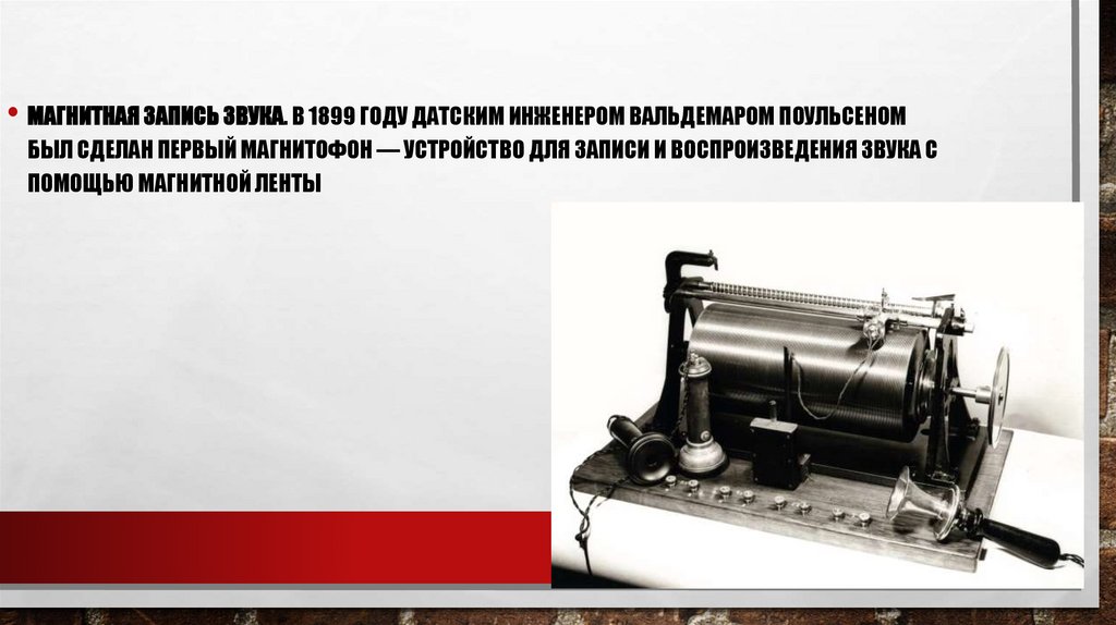 • МАГНИТНАЯ ЗАПИСЬ ЗВУКА. В 1899 ГОДУ ДАТСКИМ ИНЖЕНЕРОМ ВАЛЬДЕМАРОМ ПОУЛЬСЕНОМБЫЛ СДЕЛАН ПЕРВЫЙ МАГНИТОФОН — УСТРОЙСТВО ДЛЯ ЗАПИСИ И ВОСПРОИЗВЕДЕНИЯ ЗВУКА С
