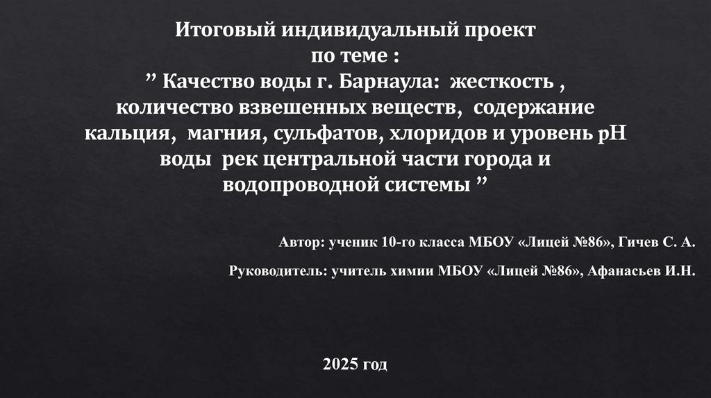 1. Итоговый индивидуальный проект по теме : ” Качество воды г. Барнаула: жесткость , количество взвешенных веществ, содержание