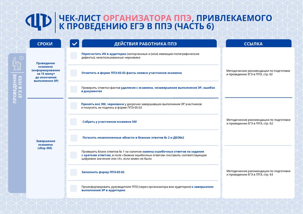 ЧЕК-ЛИСТ ОРГАНИЗАТОРА ППЭ, ПРИВЛЕКАЕМОГОК ПРОВЕДЕНИЮ ЕГЭ В ППЭ (ЧАСТЬ 6)