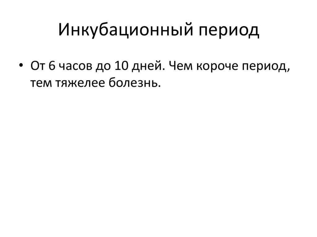 Инкубационный период• От 6 часов до 10 дней. Чем короче период,