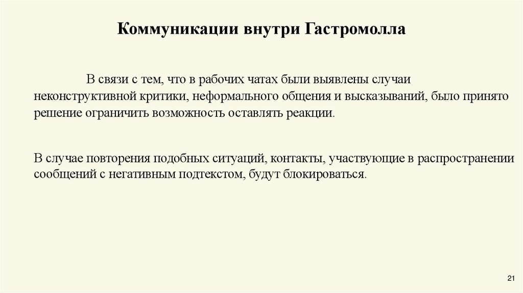 Коммуникации внутри ГастромоллаВ связи с тем, что в рабочих чатах были выявлены случаи