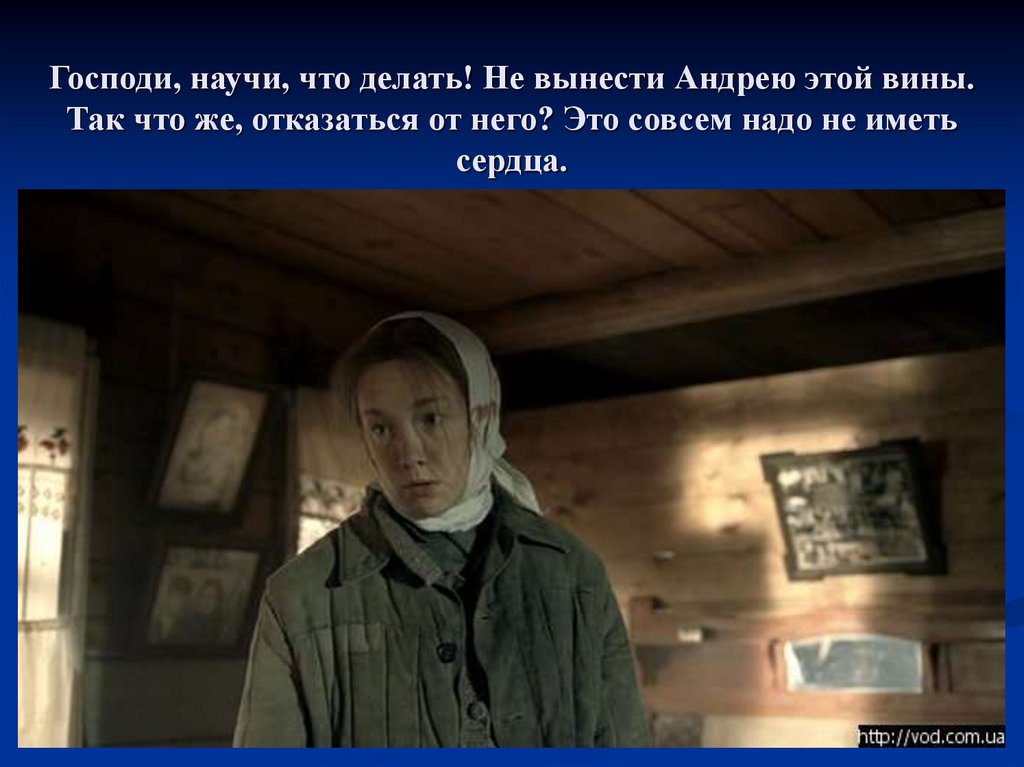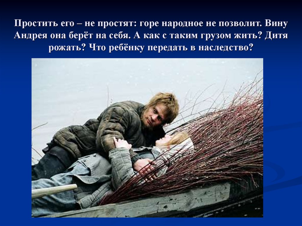 12. Простить его – не простят: горе народное не позволит. Вину Андрея она берёт на себя. А как с таким грузом жить? Дитя рожать?