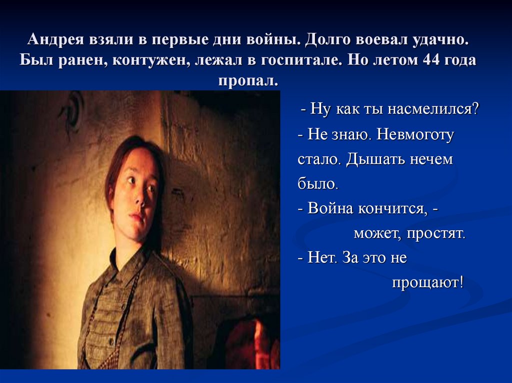 4. Андрея взяли в первые дни войны. Долго воевал удачно. Был ранен, контужен, лежал в госпитале. Но летом 44 года пропал.