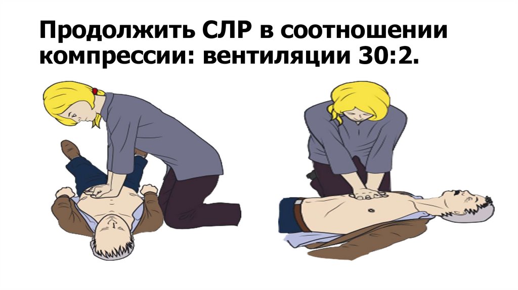 16. Продолжить СЛР в соотношении компрессии: вентиляции 30:2.