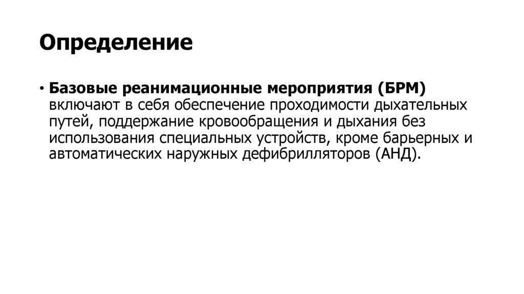 • Базовые реанимационные мероприятия (БРМ)включают в себя обеспечение проходимости дыхательных
