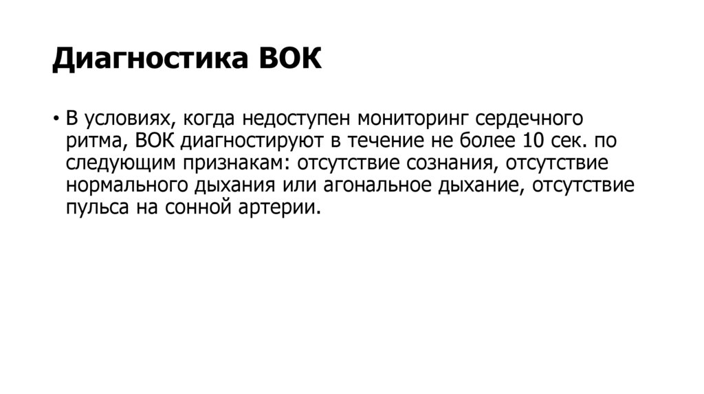 • В условиях, когда недоступен мониторинг сердечногоритма, ВОК диагностируют в течение не более 10 сек. по