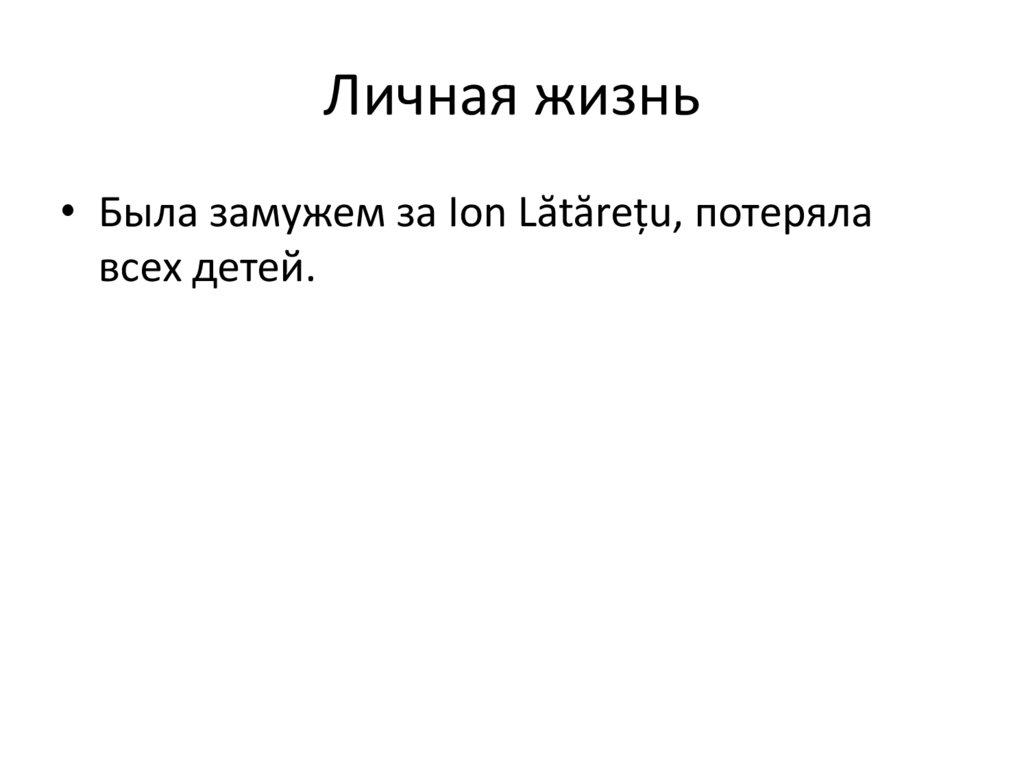 Личная жизнь• Была замужем за Ion Lătărețu, потеряла