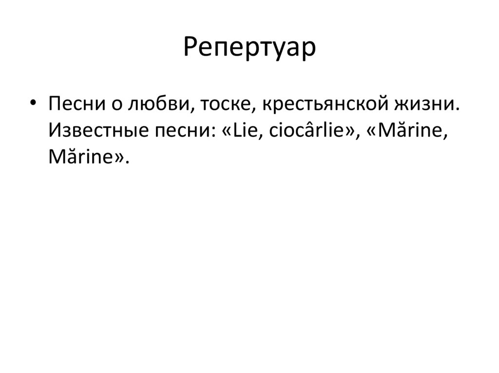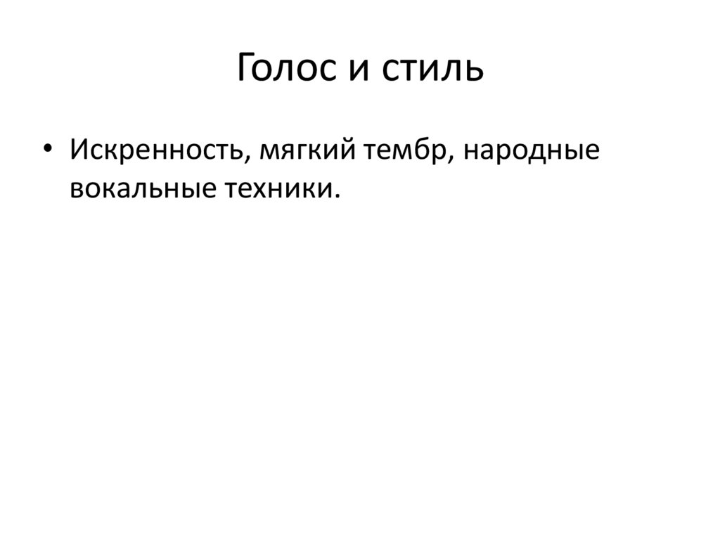 Репертуар• Песни о любви, тоске, крестьянской жизни.