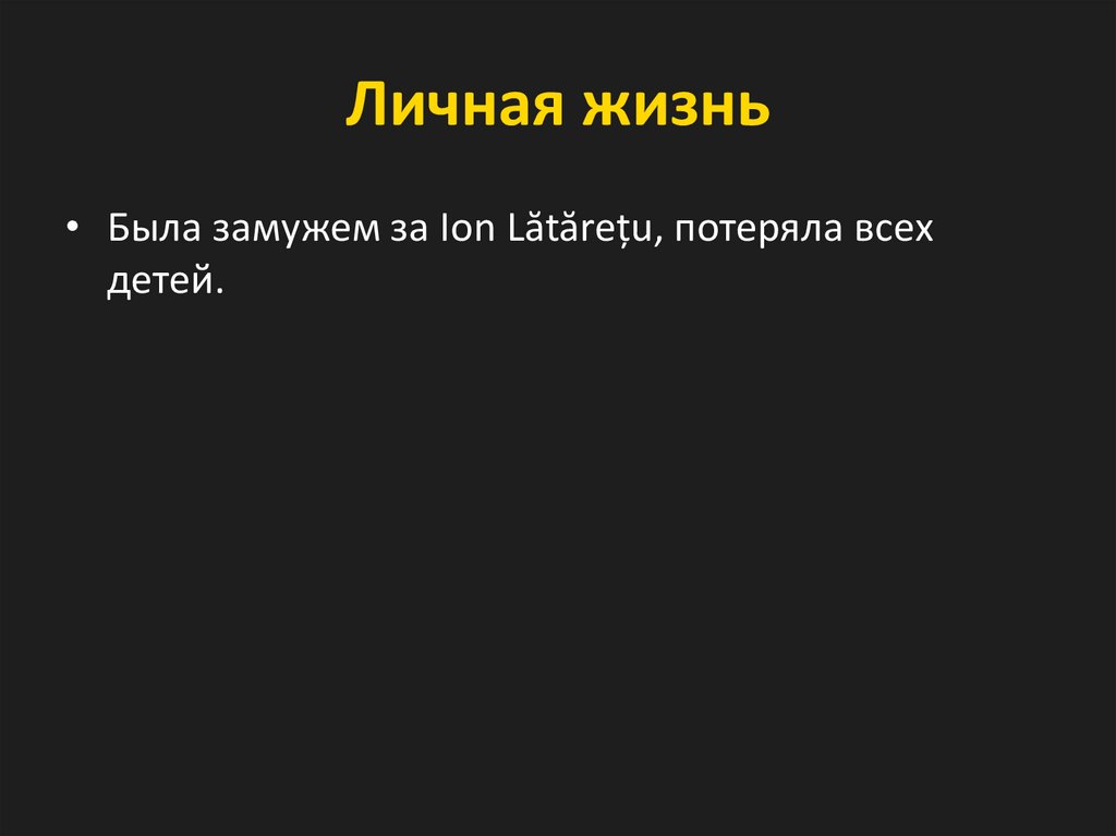 Личная жизнь• Была замужем за Ion Lătărețu, потеряла всех