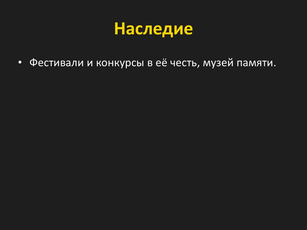 Наследие• Фестивали и конкурсы в её честь, музей памяти.