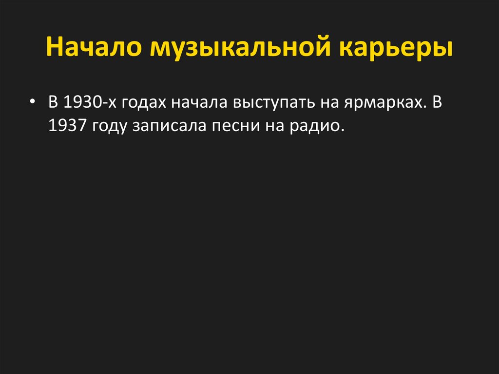 Начало музыкальной карьеры• В 1930-х годах начала выступать на ярмарках. В