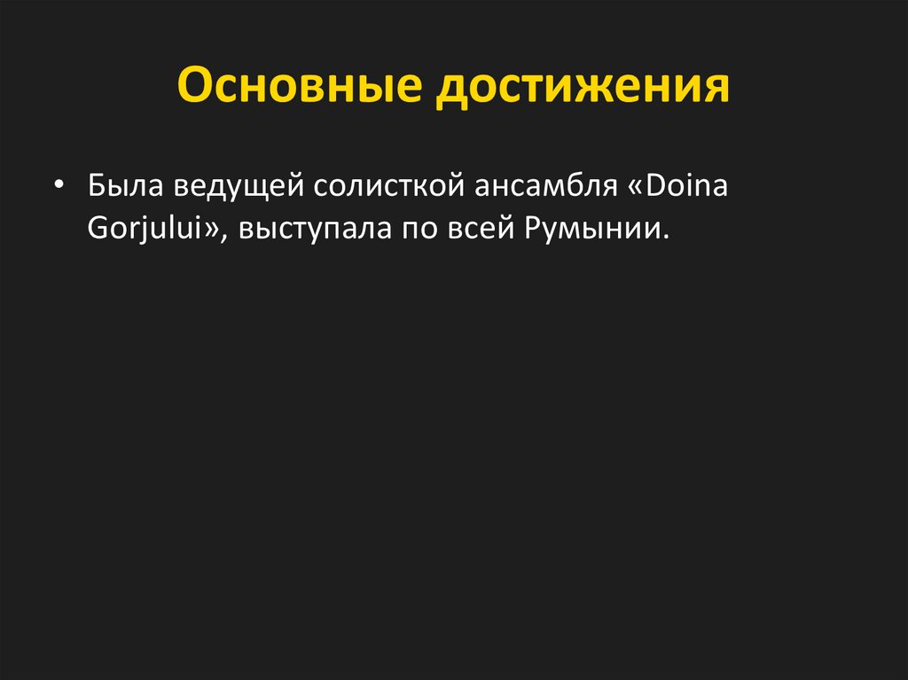 Основные достижения• Была ведущей солисткой ансамбля «Doina
