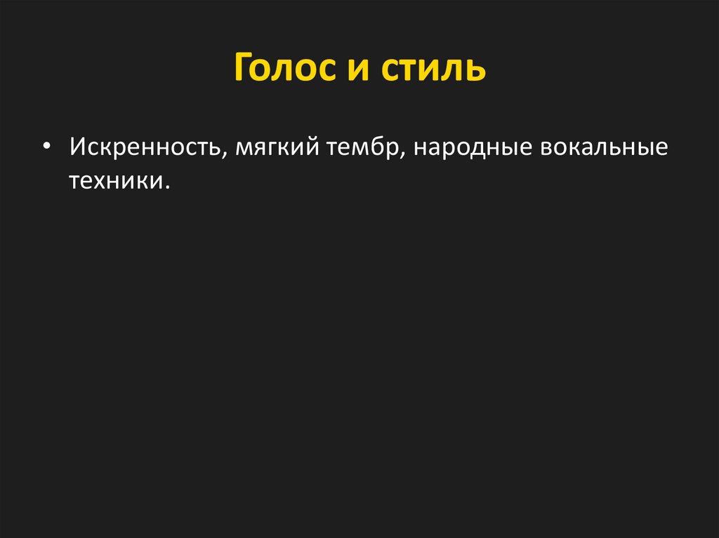 Голос и стиль• Искренность, мягкий тембр, народные вокальные