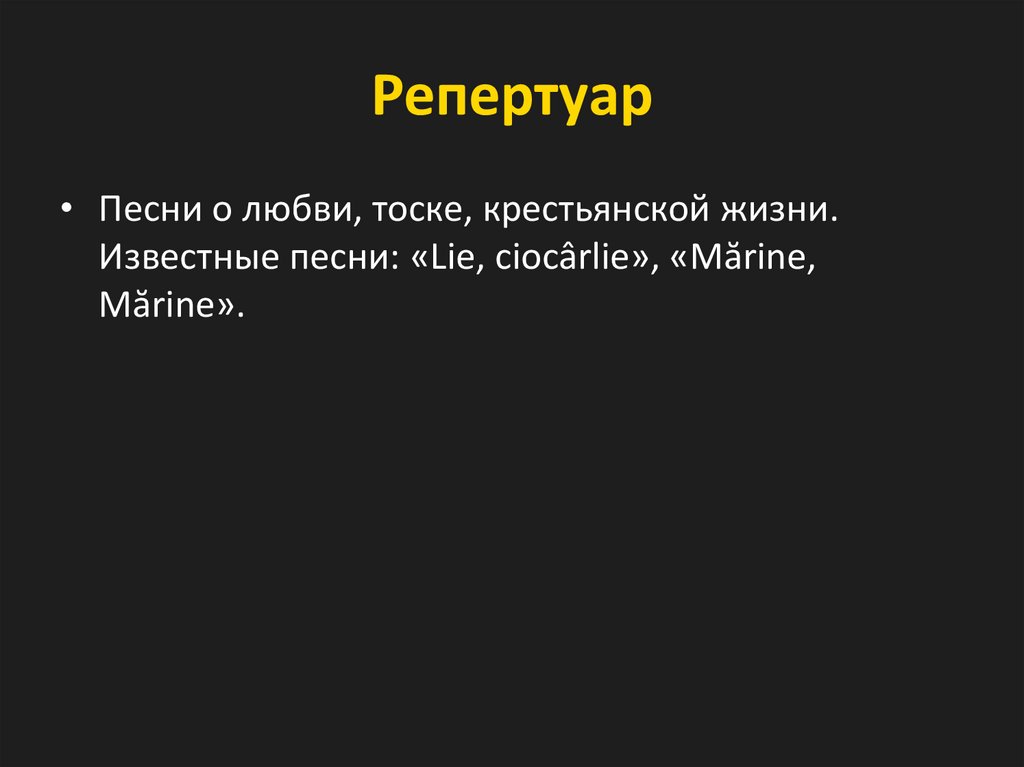 Репертуар• Песни о любви, тоске, крестьянской жизни.