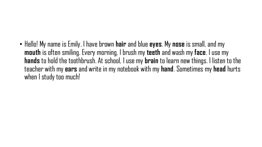 • Hello! My name is Emily. I have brown hair and blue eyes. My nose is small, and mymouth is often smiling. Every morning, I brush my teeth and wash my face. I use my