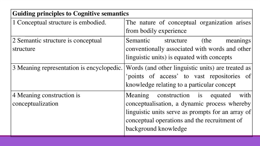 3. Meaning representation is encyclopedic.The third central principle of cognitive semantics holds that