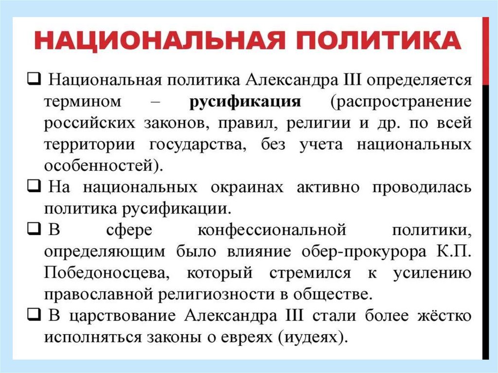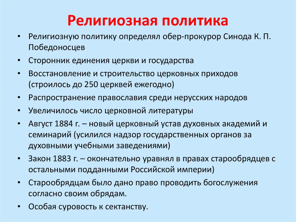 • Религиозную политику определял обер-прокурор Синода К. П.Победоносцев