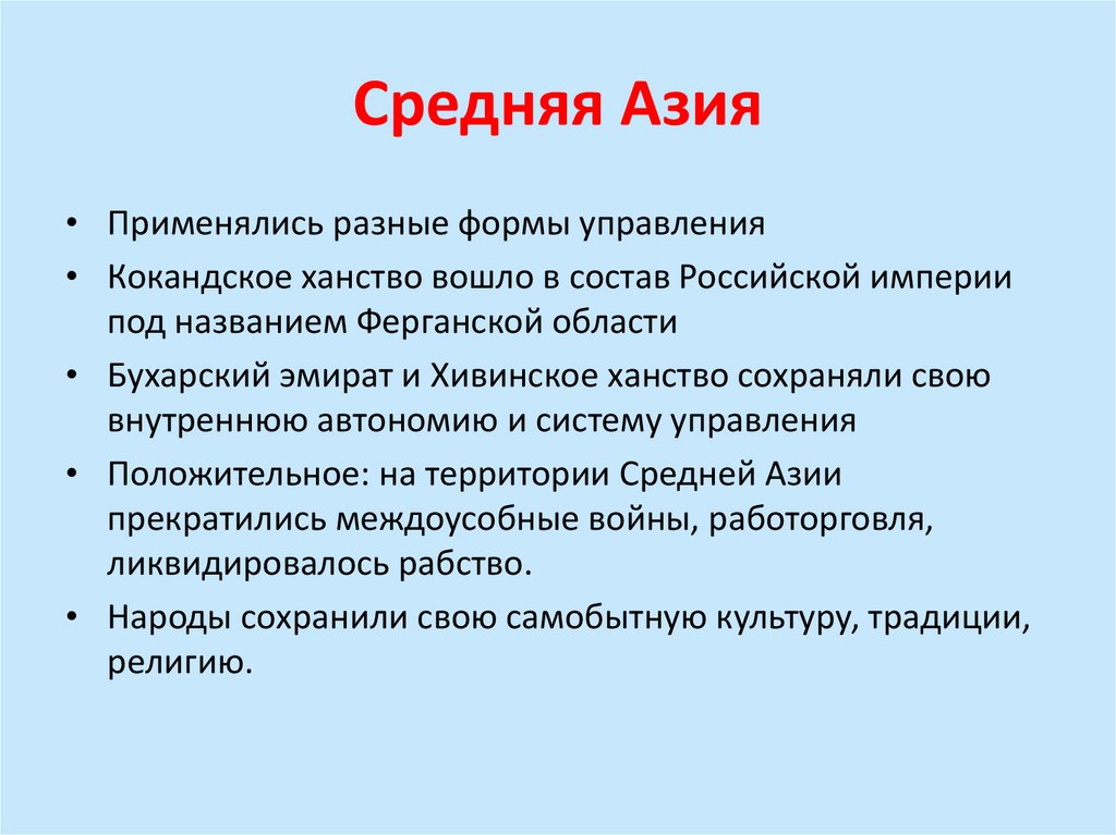 • Применялись разные формы управления• Кокандское ханство вошло в состав Российской империи