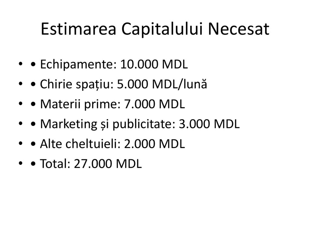 Estimarea Capitalului Necesat• • Echipamente: 10.000 MDL