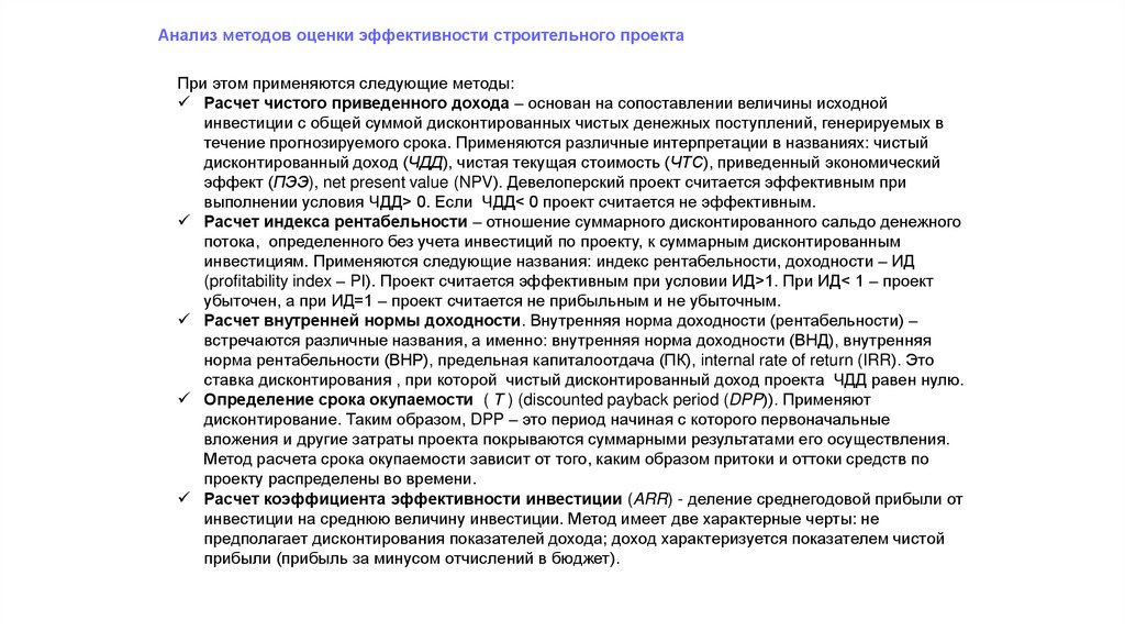 Анализ методов оценки эффективности строительного проектаПри этом применяются следующие методы: