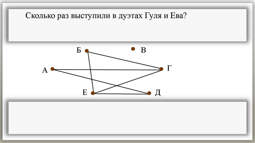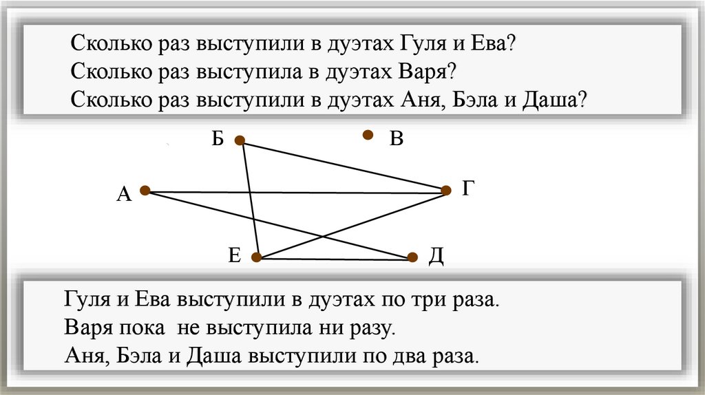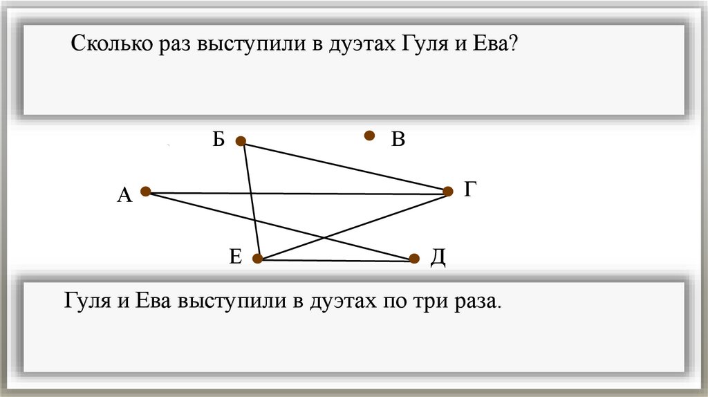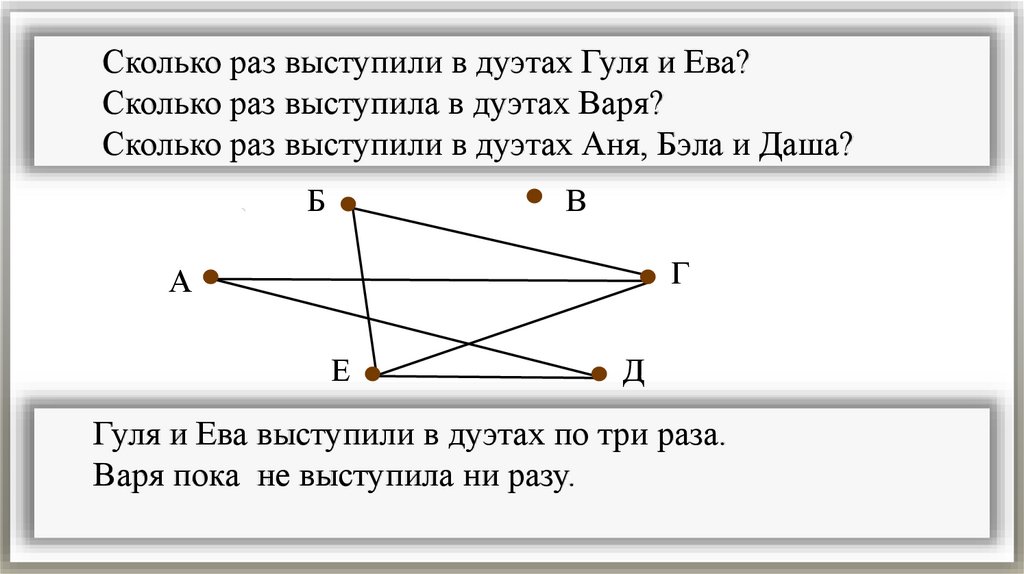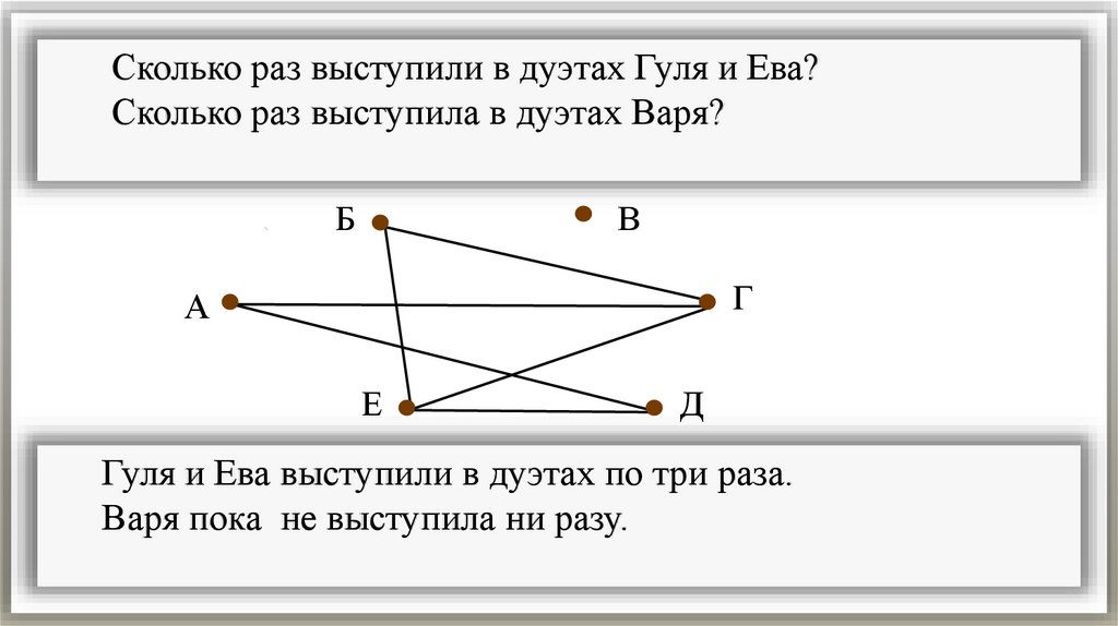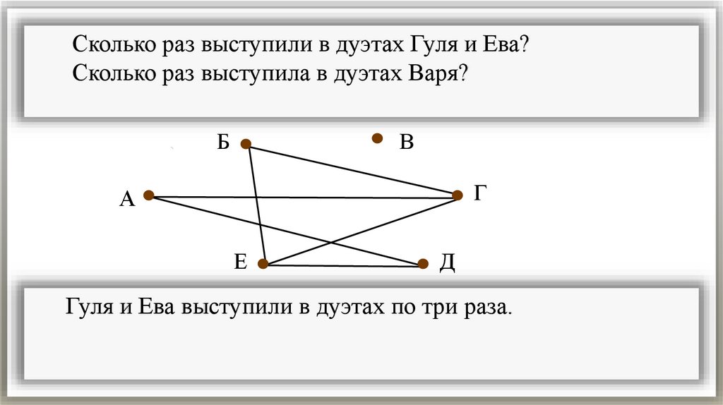 Сколько раз выступили в дуэтах Гуля и Ева?Сколько раз выступила в дуэтах Варя?