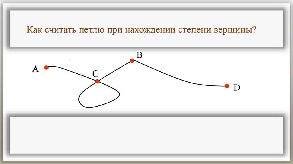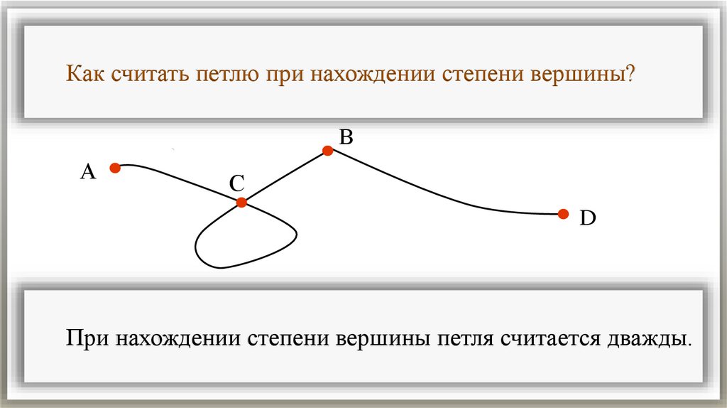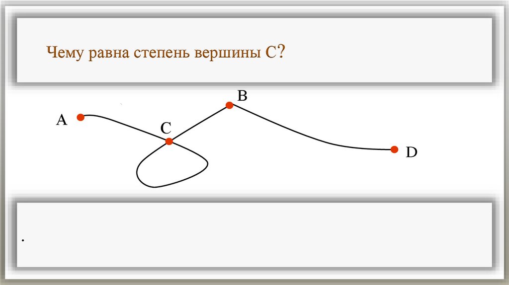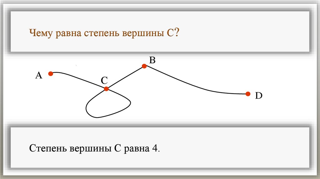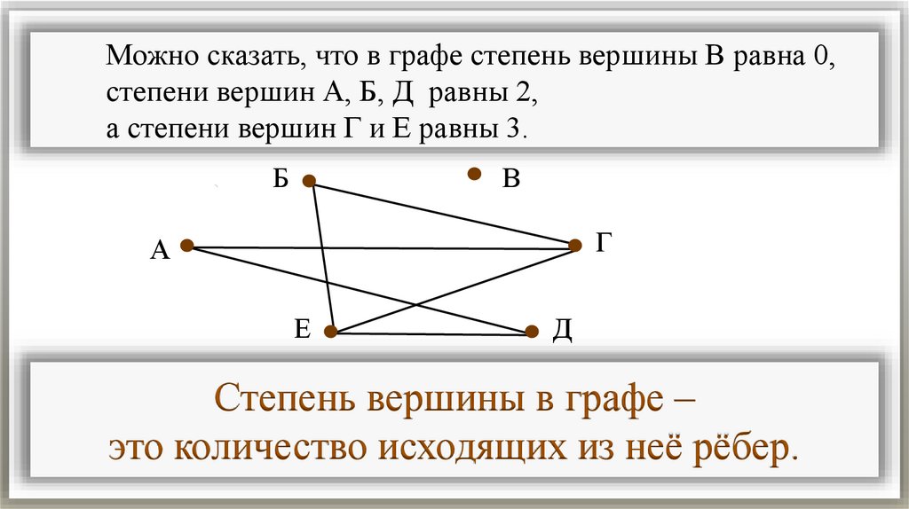 Можно сказать, что в графе степень вершины В равна 0,степени вершин А, Б, Д равны 2,