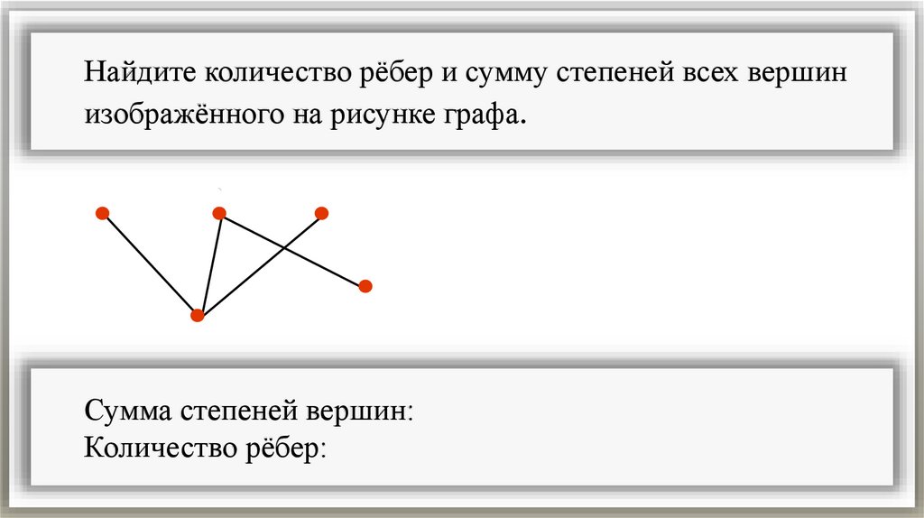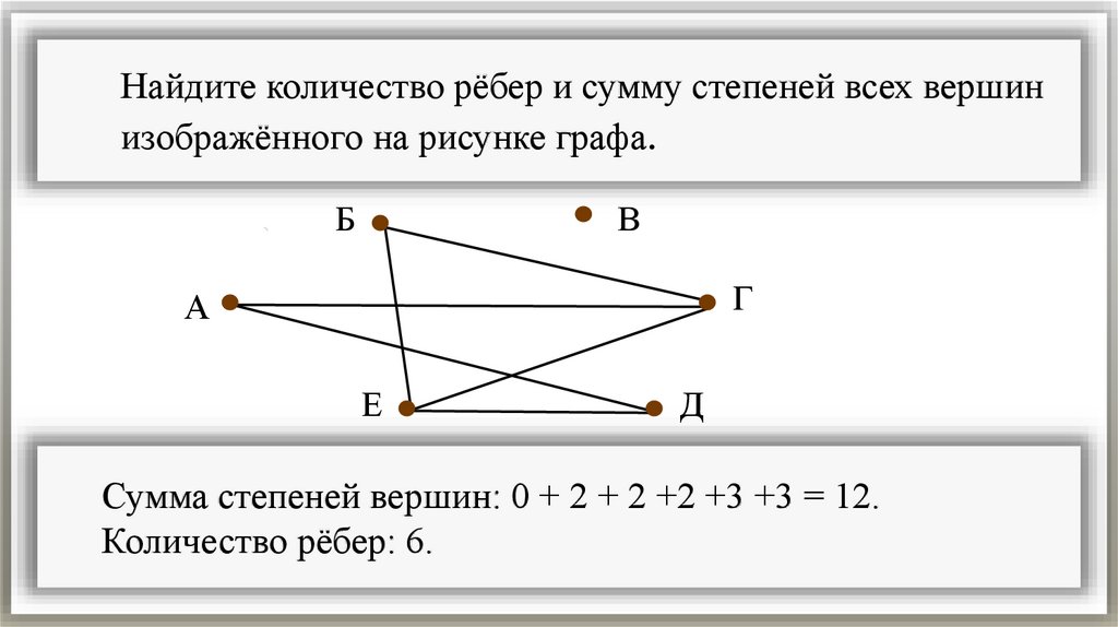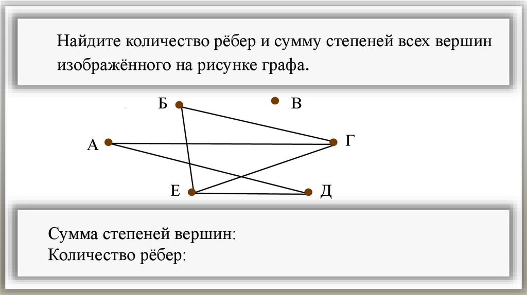 Найдите количество рёбер и сумму степеней всех вершинизображённого на рисунке графа.