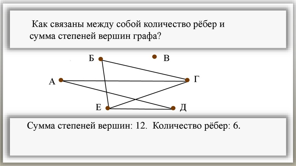 Сумма степеней вершин: 12. Количество рёбер: 6.