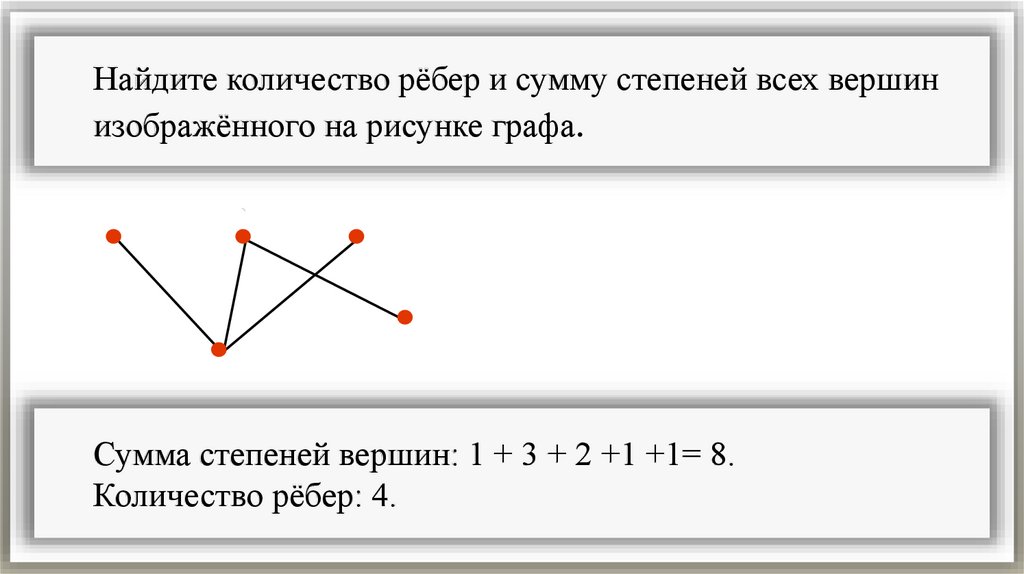 Сумма степеней вершин: 8. Количество рёбер: 4.