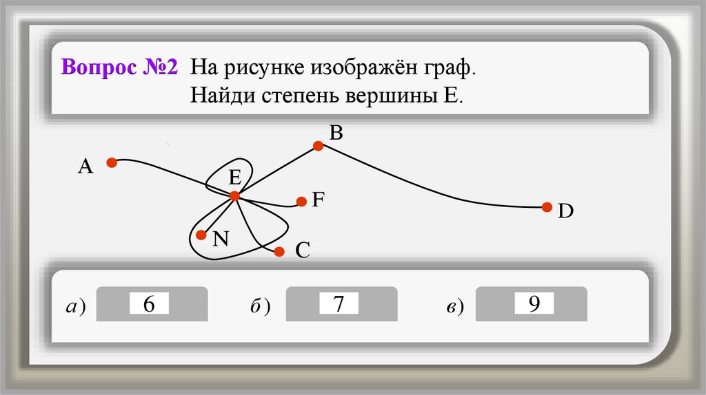 Вопрос №2 На рисунке изображён граф.Найди степень вершины Е.
