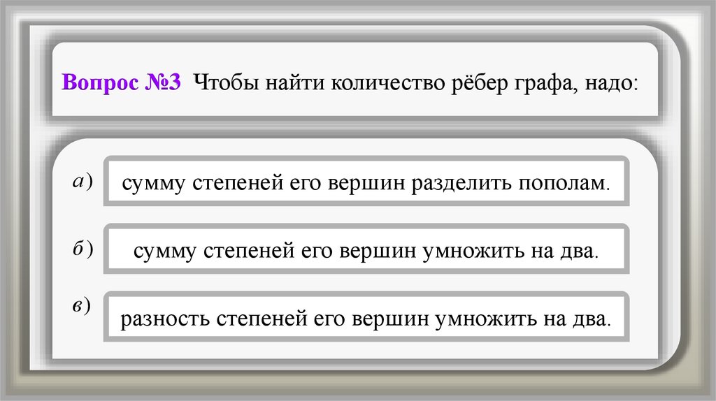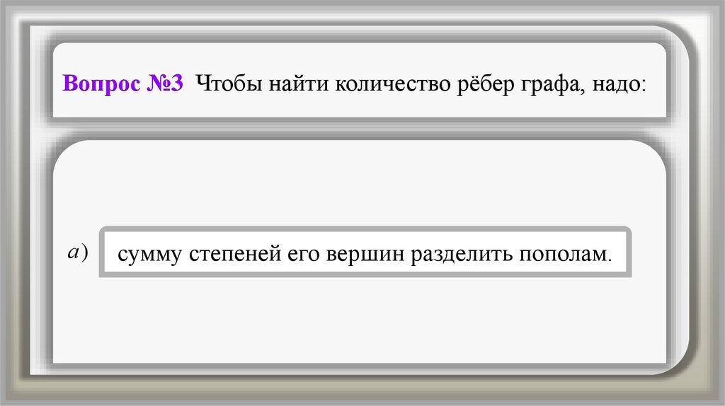 Вопрос №3 Чтобы найти количество рёбер графа, надо:а)