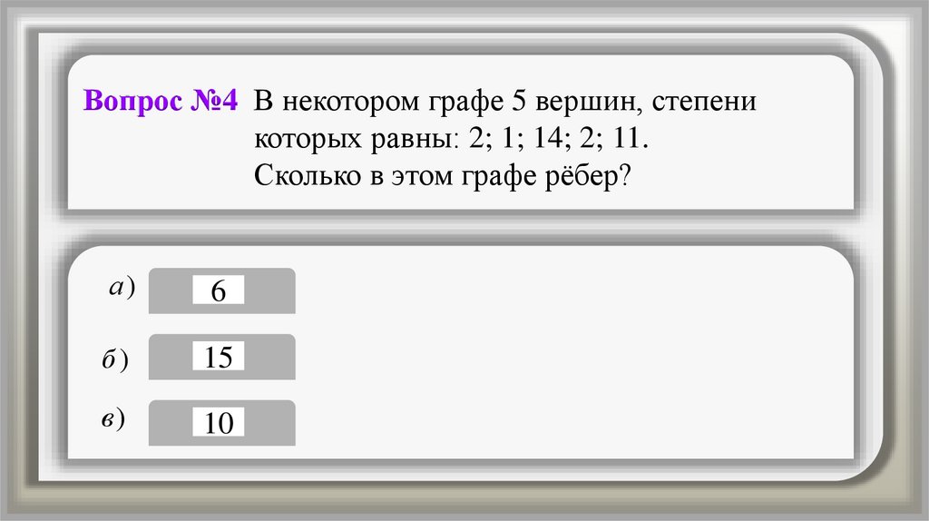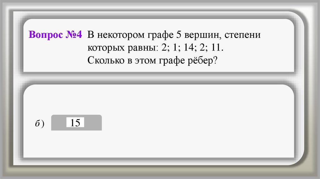 Вопрос №4 В некотором графе 5 вершин, степеникоторых равны: 2; 1; 14; 2; 11.