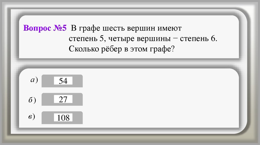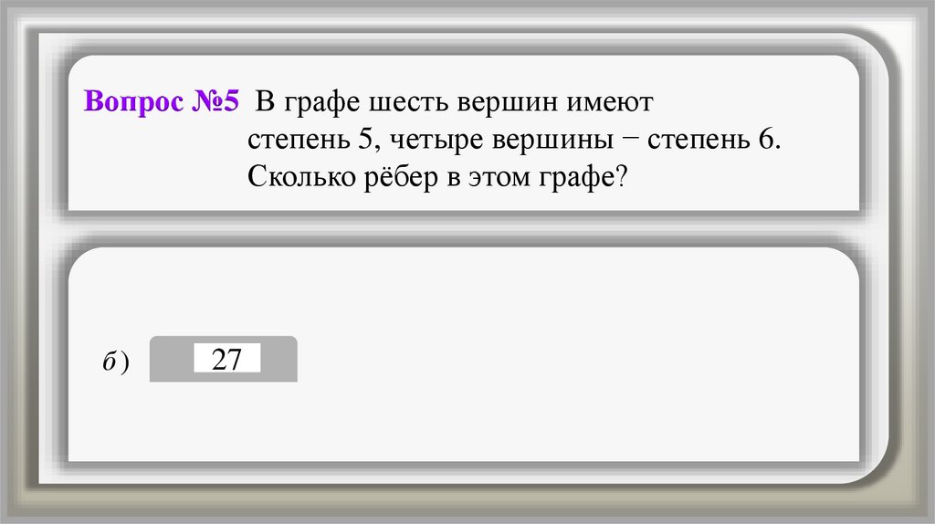 Вопрос №5 В графе шесть вершин имеютстепень 5, четыре вершины − степень 6.