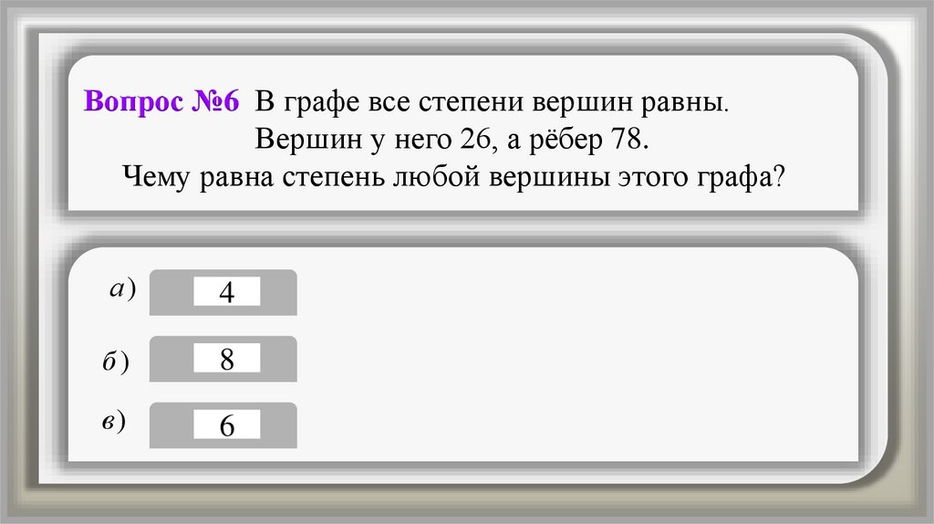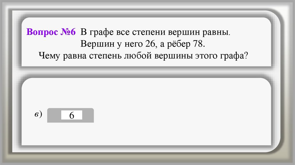 Вопрос №6 В графе все степени вершин равны.Вершин у него 26, а рёбер 78.