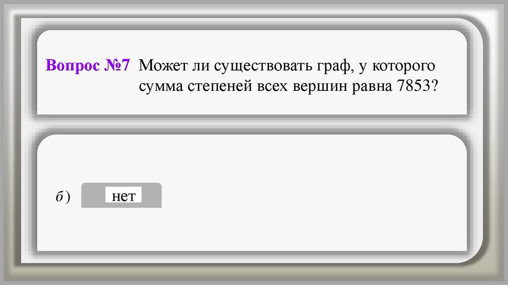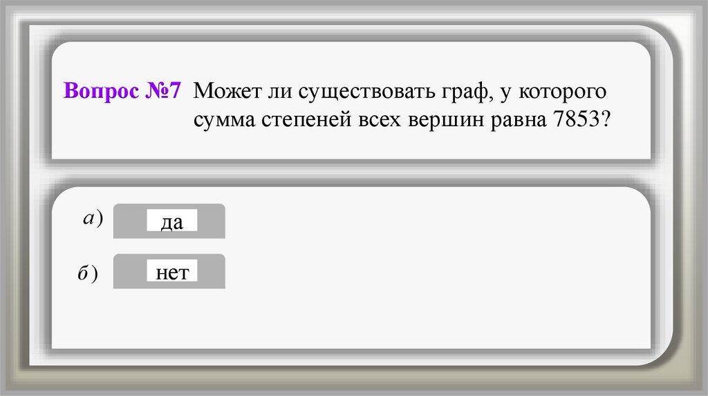 Вопрос №7 Может ли существовать граф, у которогосумма степеней всех вершин равна 7853?