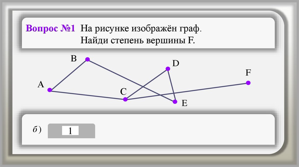 Вопрос №1 На рисунке изображён граф.Найди степень вершины F.