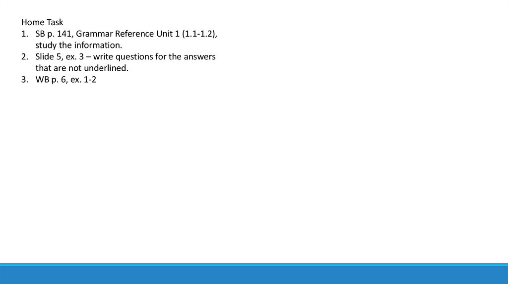 Home Task1. SB p. 141, Grammar Reference Unit 1 (1.1-1.2),