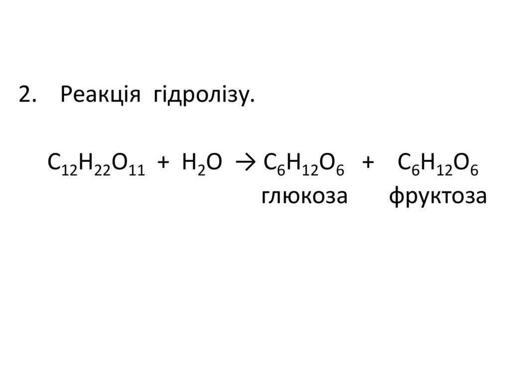 2. Реакція гідролізу.С12Н22О11 + Н2О → С6Н12О6 + С6Н12О6
