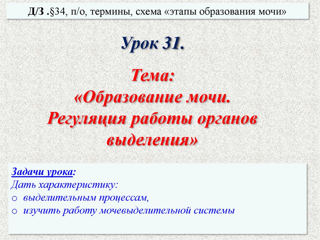 Д/З .§34, п/о, термины, схема «этапы образования мочи»Урок 31.