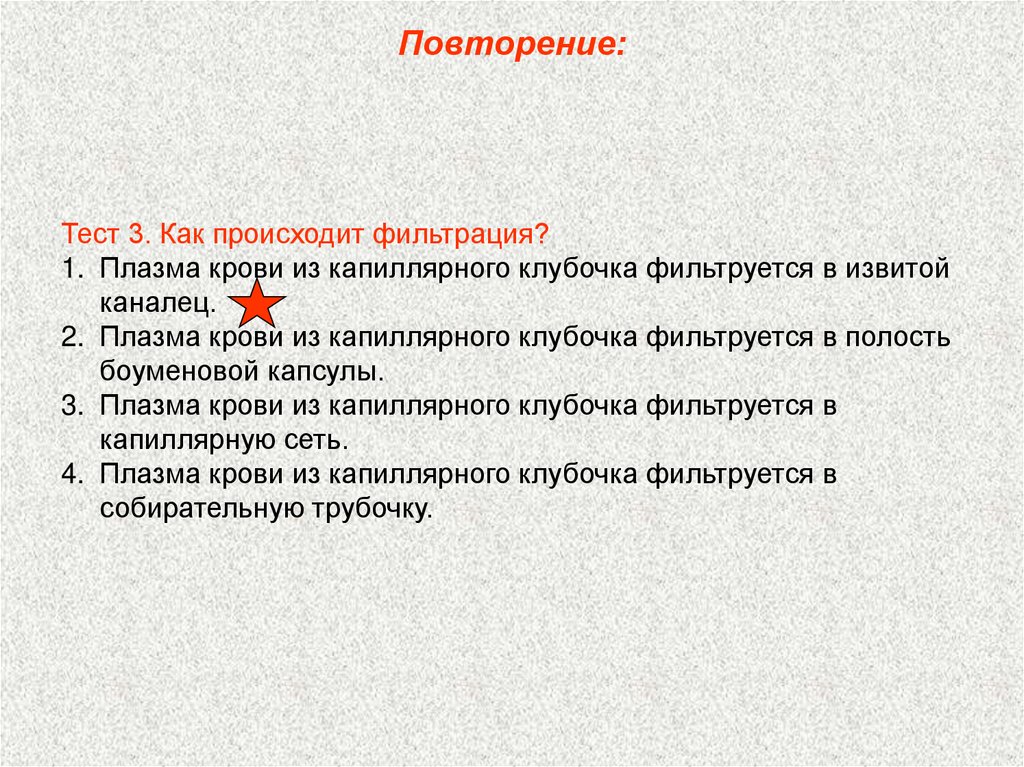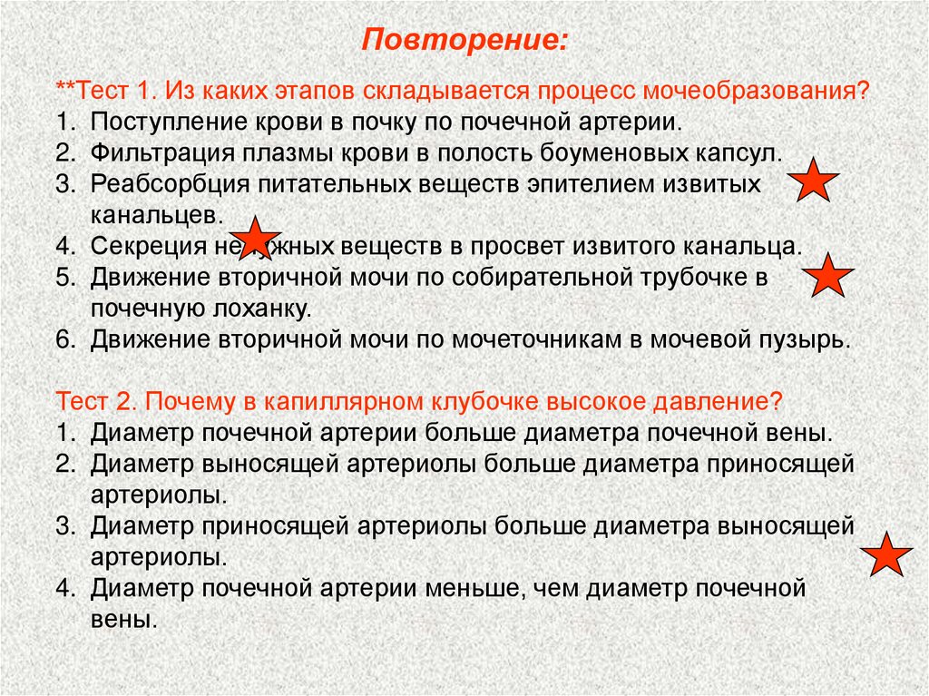 Повторение:**Тест 1. Из каких этапов складывается процесс мочеобразования?
