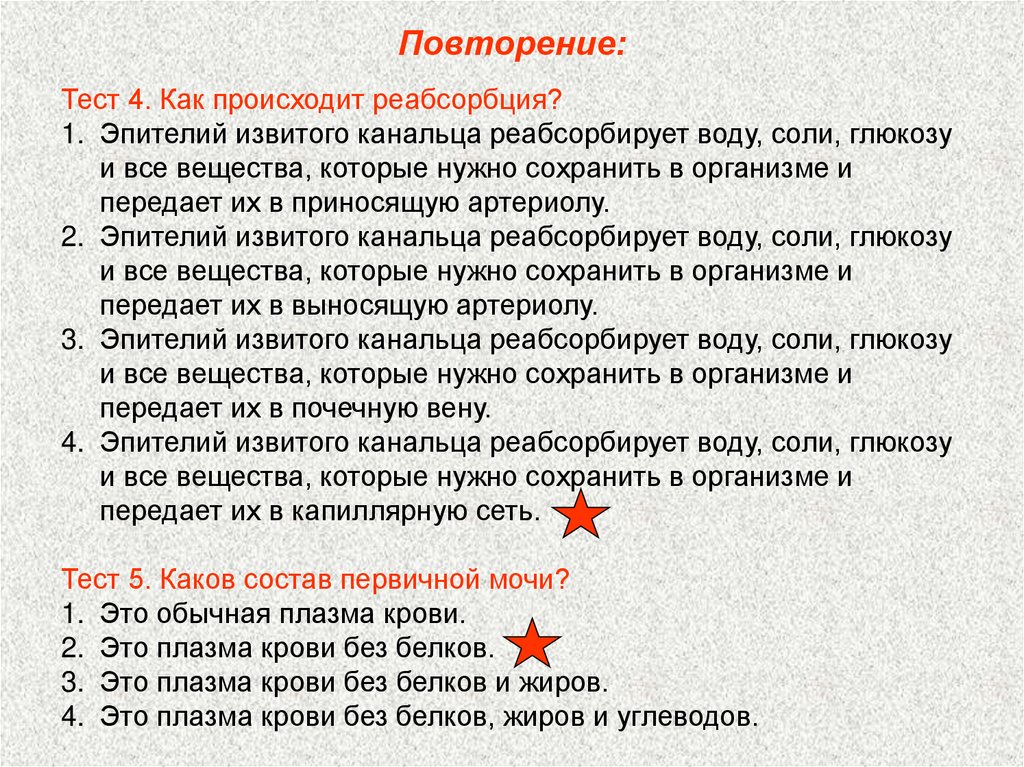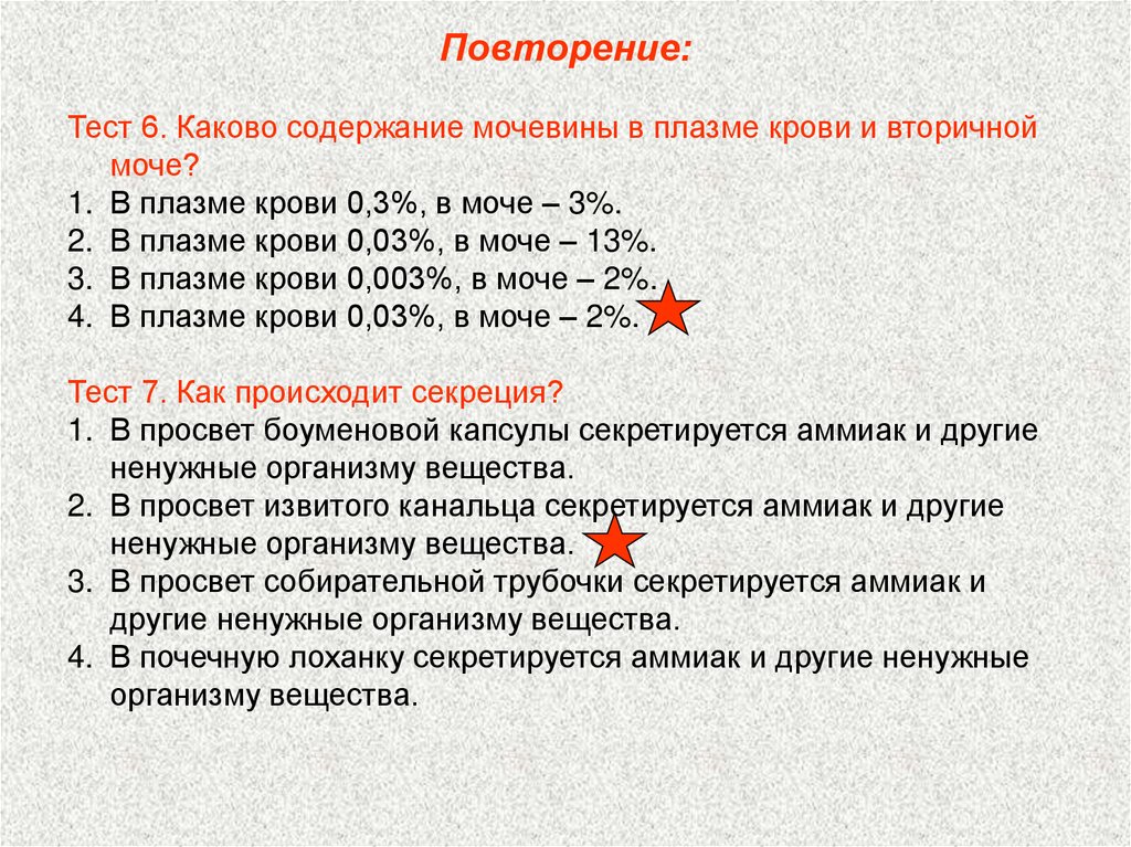 Повторение:Тест 6. Каково содержание мочевины в плазме крови и вторичной