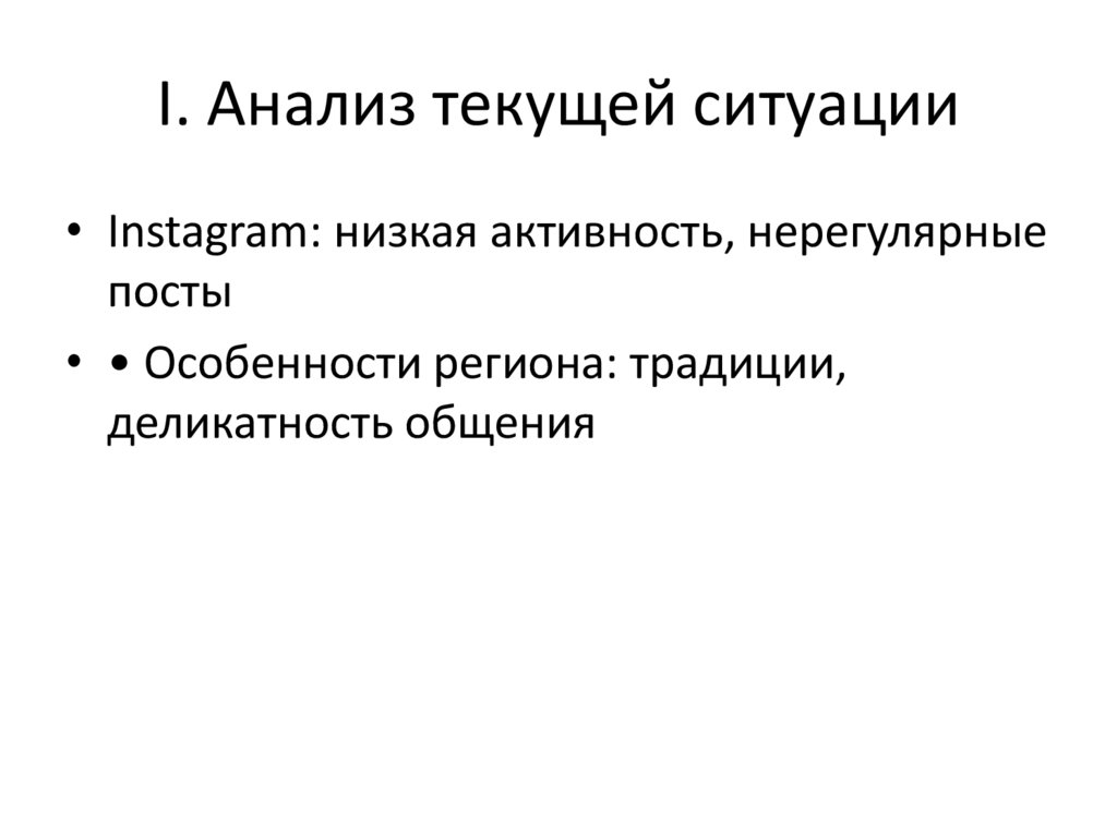 I. Анализ текущей ситуации• Instagram: низкая активность, нерегулярные