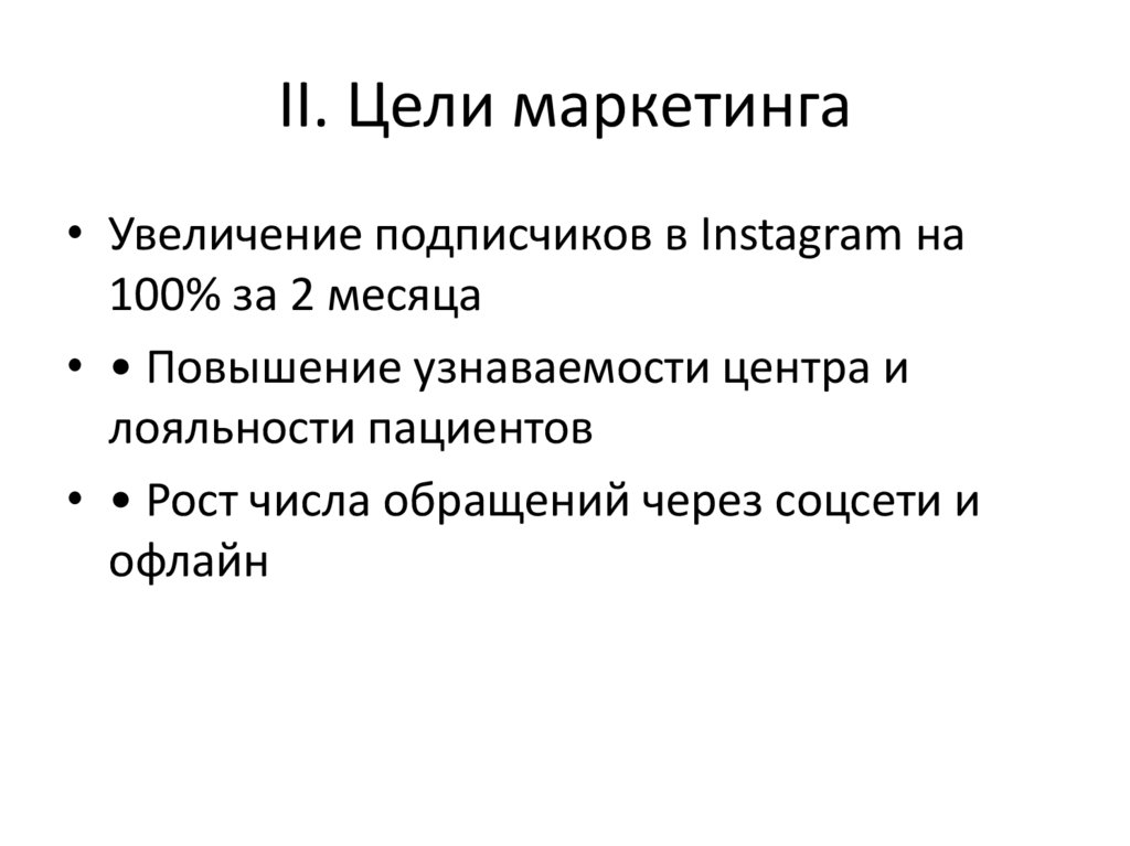 II. Цели маркетинга• Увеличение подписчиков в Instagram на