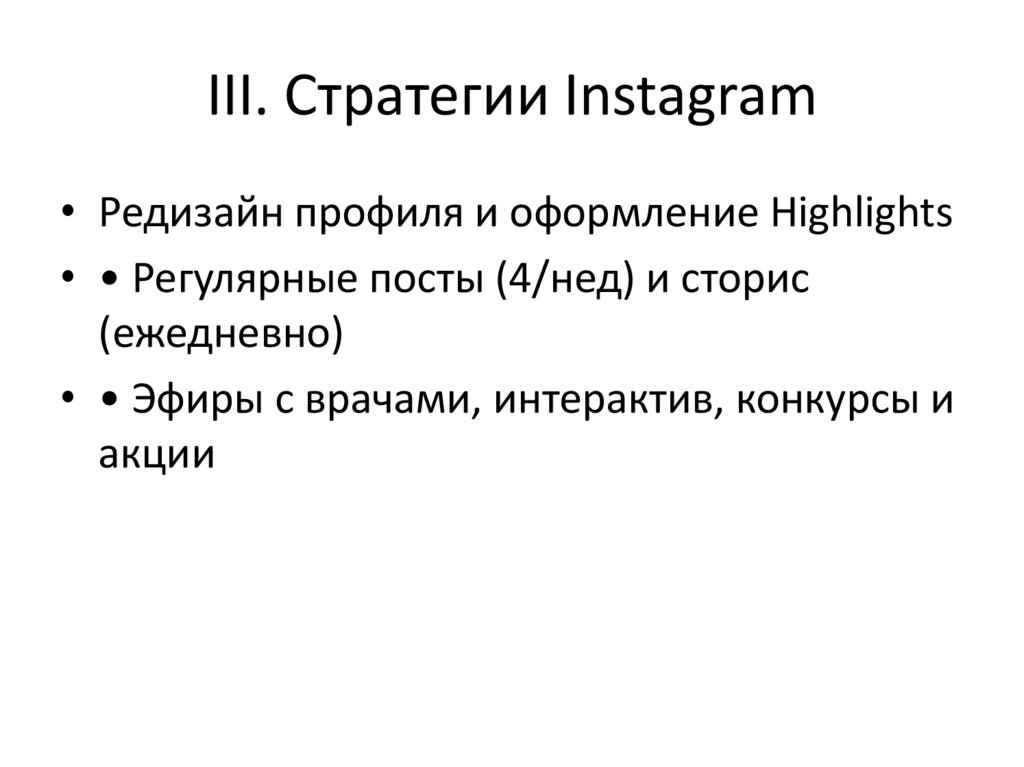 III. Стратегии Instagram• Редизайн профиля и оформление Highlights