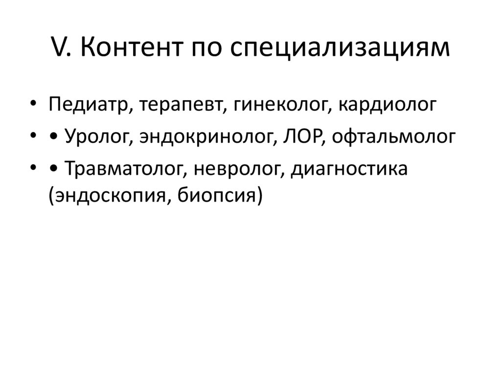 V. Контент по специализациям• Педиатр, терапевт, гинеколог, кардиолог