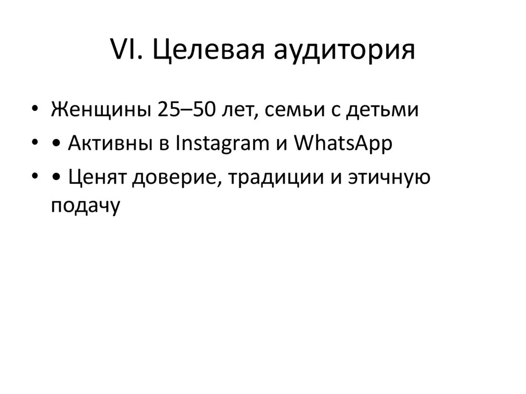 VI. Целевая аудитория• Женщины 25–50 лет, семьи с детьми