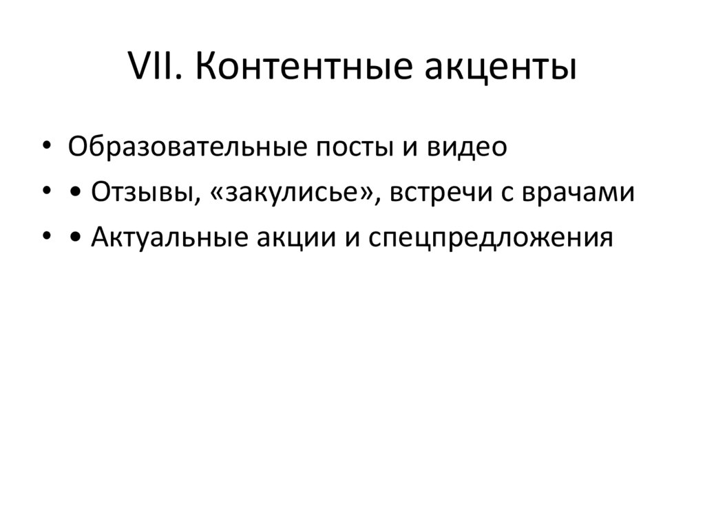 VII. Контентные акценты• Образовательные посты и видео