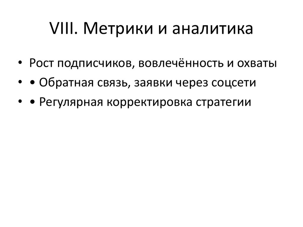 VIII. Метрики и аналитика• Рост подписчиков, вовлечённость и охваты