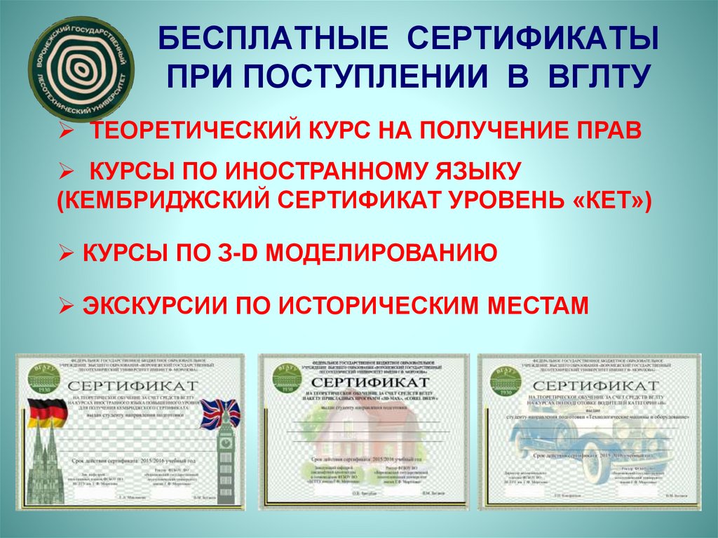 БЕСПЛАТНЫЕ СЕРТИФИКАТЫПРИ ПОСТУПЛЕНИИ В ВГЛТУ